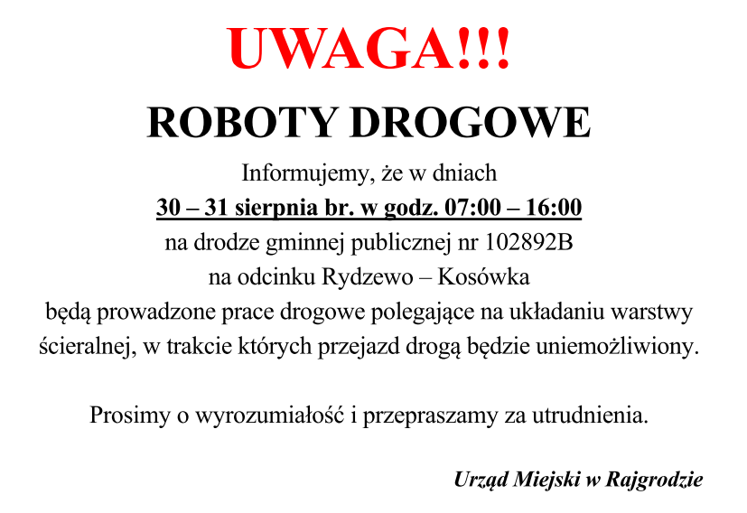 Informujemy, że w dniach 30 – 31 sierpnia br. w godz. 07:00 – 16:00 na drodze gminnej publicznej nr 102892B na odcinku Rydzewo – Kosówka będą prowadzone prace drogowe polegające na układaniu warstwy ścieralnej,
